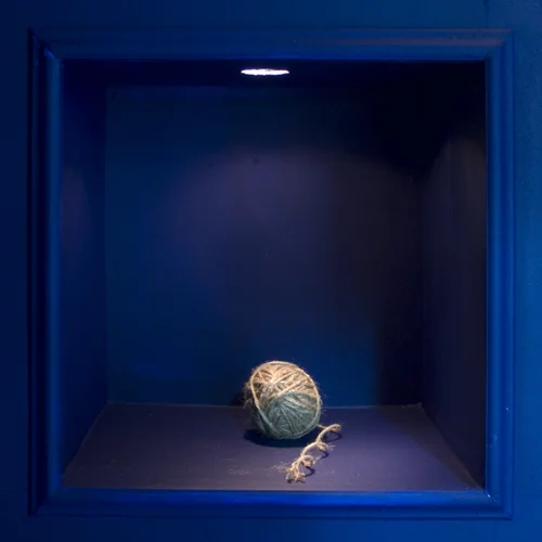 Room with water, thin trip wire, sound activated single dangling light bulb. Fremont House, Tucson, Arizona.